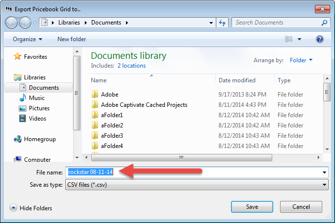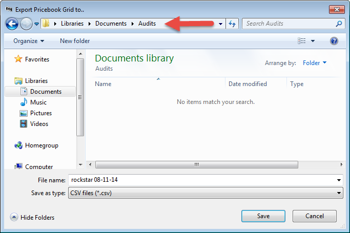 D: Type a name for your audit file. We recommend the name contains what you are auditing and the date. In this example our name is 'rockstar 08-12-14' See next screen shot:
