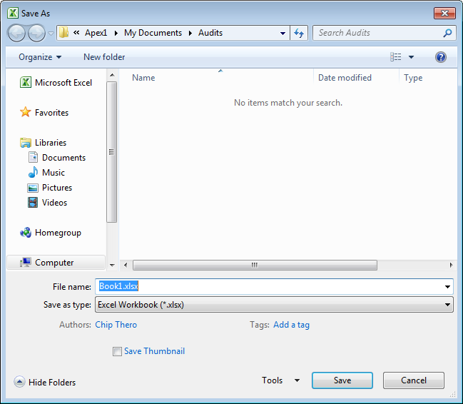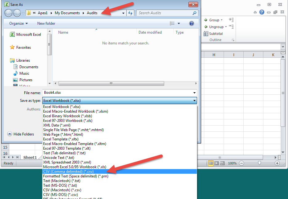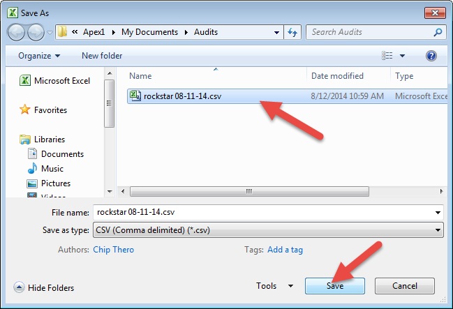 B. Make sure you are in the folder where you created the Audit file originally. Select CSV in 'Save as Type' field: