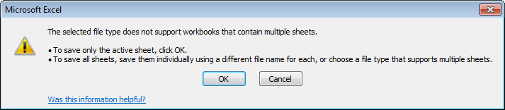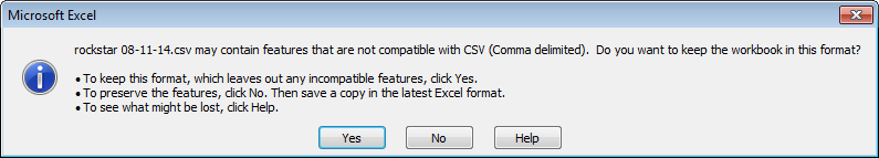 E. Excel will show 1 or 2 File Type warning windows. They are warning you that this file type does not have all the features that a regular Excel will have. This is normal, just click the 'OK' button in both windows: